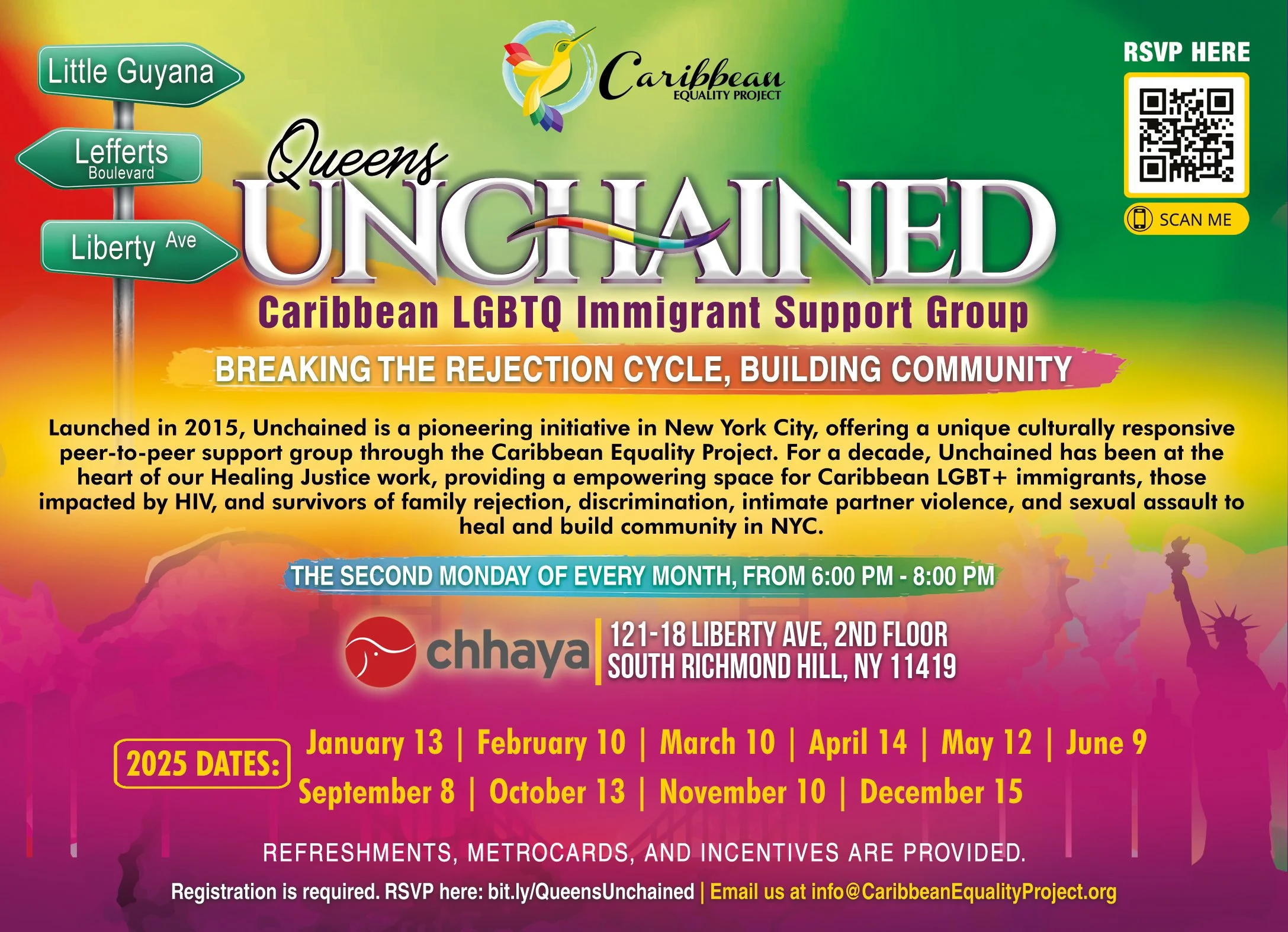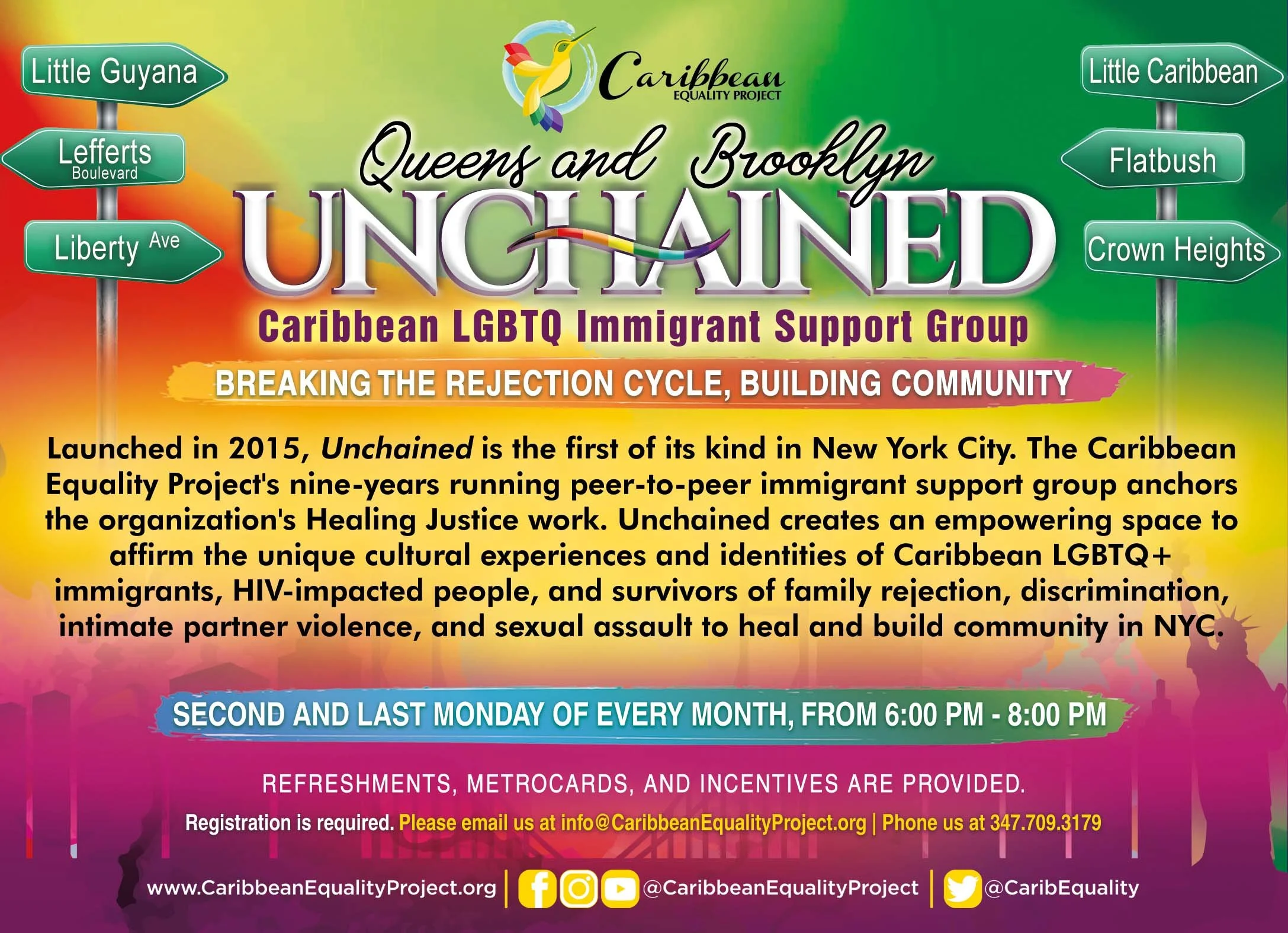 Caribbean Equality Project, founded in 2015 in response to anti-LGBTQ violence in Richmond Hill, Queens, has been actively supporting the community. It hosts bi-monthly Unchained support groups in Queens and Brooklyn, offers immigration legal services for LGBTQ+ asylum seekers, and organizes art exhibitions. The project also addresses food insecurity and fosters civic engagement through programs focused on voting rights and legislative advocacy in New York State.
